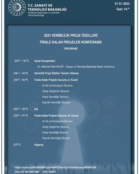 Sanayi ve Teknoloji Bakanlığı Stratejik Araştırmalar ve Verimlilik Genel Müdürlüğü tarafından gerçekleştirilen 2021 Verimlilik Proje Ödülleri kapsamında finale kalan projelerin ayrıntılarının kamuoyu ile paylaşılması amacıyla 31 Ocak 2022 Pazartesi günü 14:00 – 17:00 saatleri arasında, Verimlilik Proje Ödülleri Finale Kalan Projeler Konferansı (çevrimiçi) düzenlenecektir. Bilgilerinize sunarız.