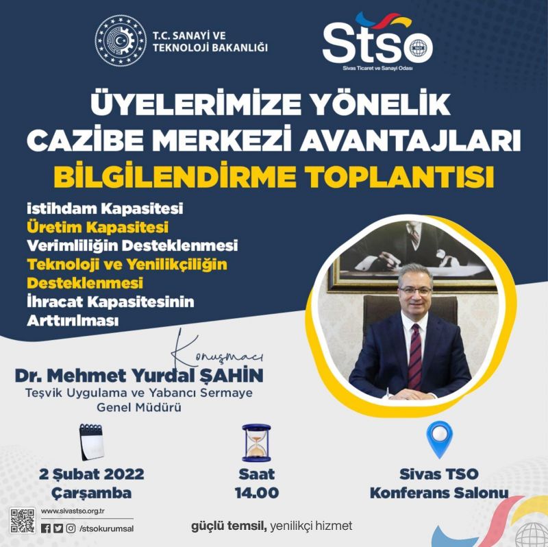 2 Şubat Çarşamba günü saat 14:00’da Sivas Ticaret ve Sanayi Odası Konferans Salonunda, Teşvik Uygulama ve Yabancı Sermaye Genel Müdürü Dr. Mehmet Yurdal Şahin’in katılımlarıyla gerçekleşecek olan “Cazibe Merkezi Avantajları” bilgilendirme toplantısına katılımlarınızı bekleriz.
