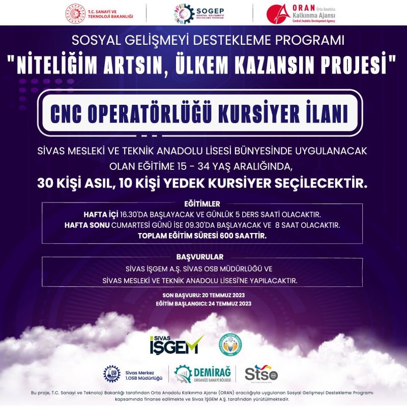ORAN Kalkınma Ajansı tarafından desteklenen, OSB Müdürlüğünün de iştirakçisi olduğu Sosyal Gelişmeyi Destekleme Programı kapsamındaki “Niteliğim Artsın, Ülkem Kazansın” projesi ile Sivas Mesleki ve Teknik Anadolu Lisesi bünyesinde uygulanacak olan CNC Operatörlüğü Kursiyer Eğitimleri için 15 – 34 yaş aralığında 30 kişi asıl, 10 kişi yedek kursiyerler seçilecektir. Eğitim Programına katılmak isteyen kursiyerler için son başvuru tarihi 20 Temmuz 2023 olarak belirlenmiş olup, eğitimler 24 Temmuz 2023 tarihinde başlayacaktır. Bilgilerinize sunarız.
