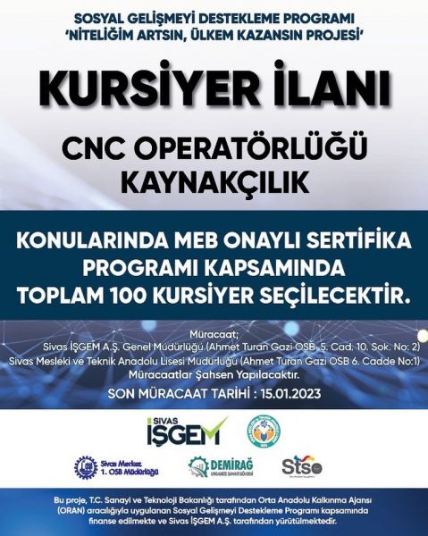 Firmalarımızın kalifiye elaman ihtiyacını karşılamak ve genç işsizliğinin önlenmesi amacıyla 15-29 yaş arasındaki gençlerden oluşan 100 kişiye mesleki beceri kazandıracak sosyal gelişmeyi destekleme programı kapsamındaki kursiyer ilanları için başvurular başlamıştır.