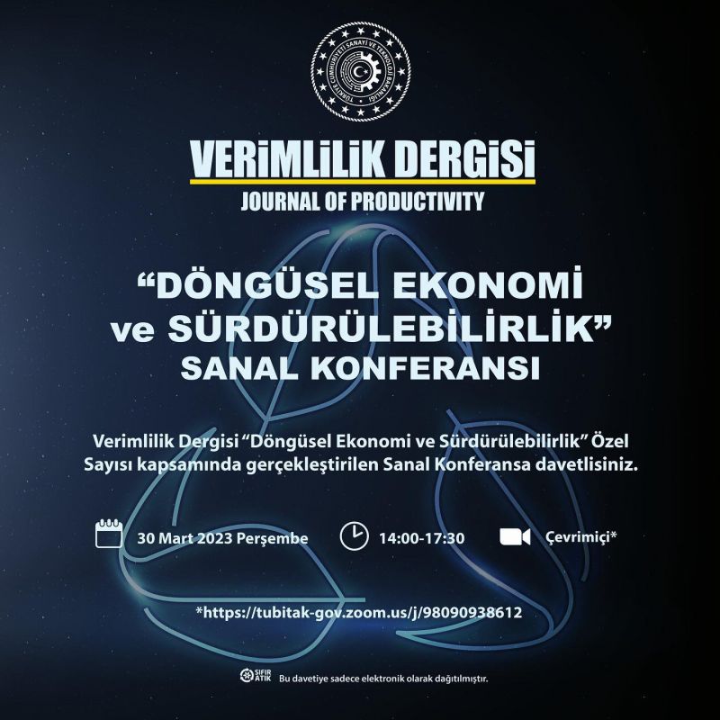 Sanayi ve Teknoloji Bakanlığının hakemli bilimsel yayını olan ve 57 yıldır yayın hayatını sürdüren Verimlilik Dergisi’nin Döngüsel Ekonomi ve Sürdürülebilirlik Özel Sayısı 5 Ocak 2033 tarihinde yayınlanmış olup, özel sayıda yayımlanan makalelerin ayrıntılarının kamuoyu ile paylaşılması amacıyla 30 Mart 2023 Perşembe günü saat 14:00 - 17:00 saatleri arasında Döngüsel Ekonomi ve Sürdürülebilirlik Özel Sayısı Konferansı çevrim içi (online) olarak düzenlenecektir.