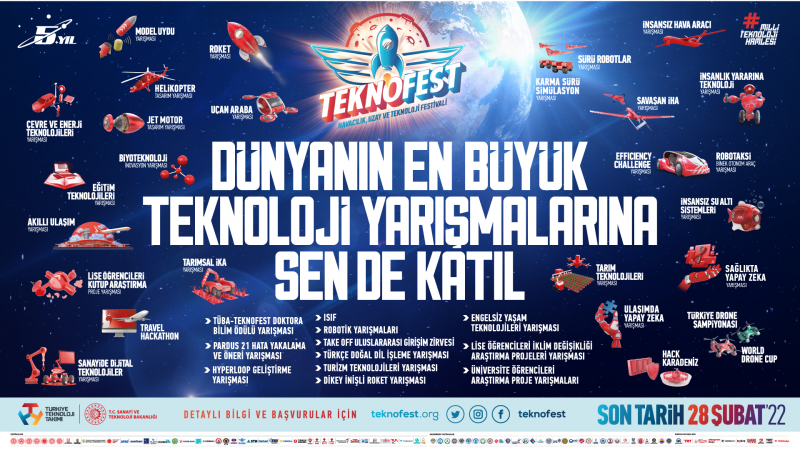 Teknofest heyecanı 2022 için yarışmalara son başvuru tarihi 28 Şubat 2022’dir. Bilgilerinize sunarız.